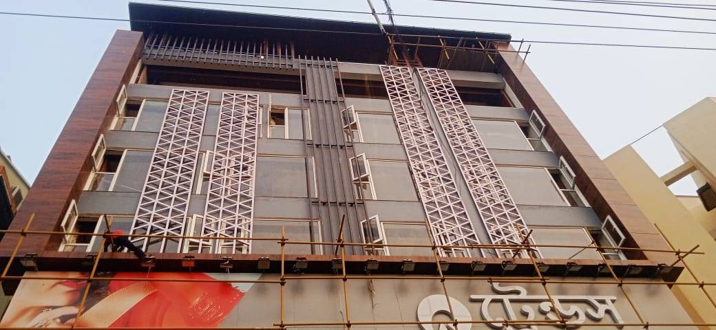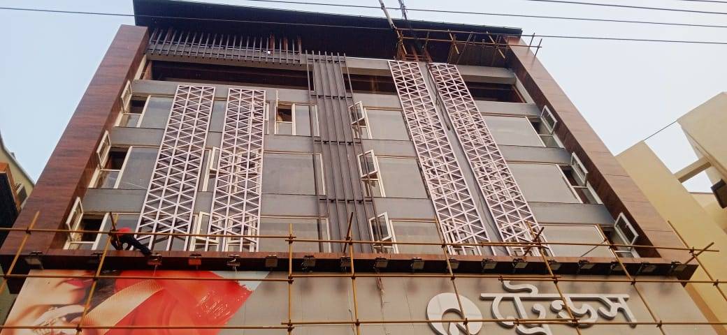 • Type of Work: HPL cladding, self-standing glass railing, WPC perforated jali cladding, MS structural work, polycarbonate pergola with MS structural work, baffle ceiling